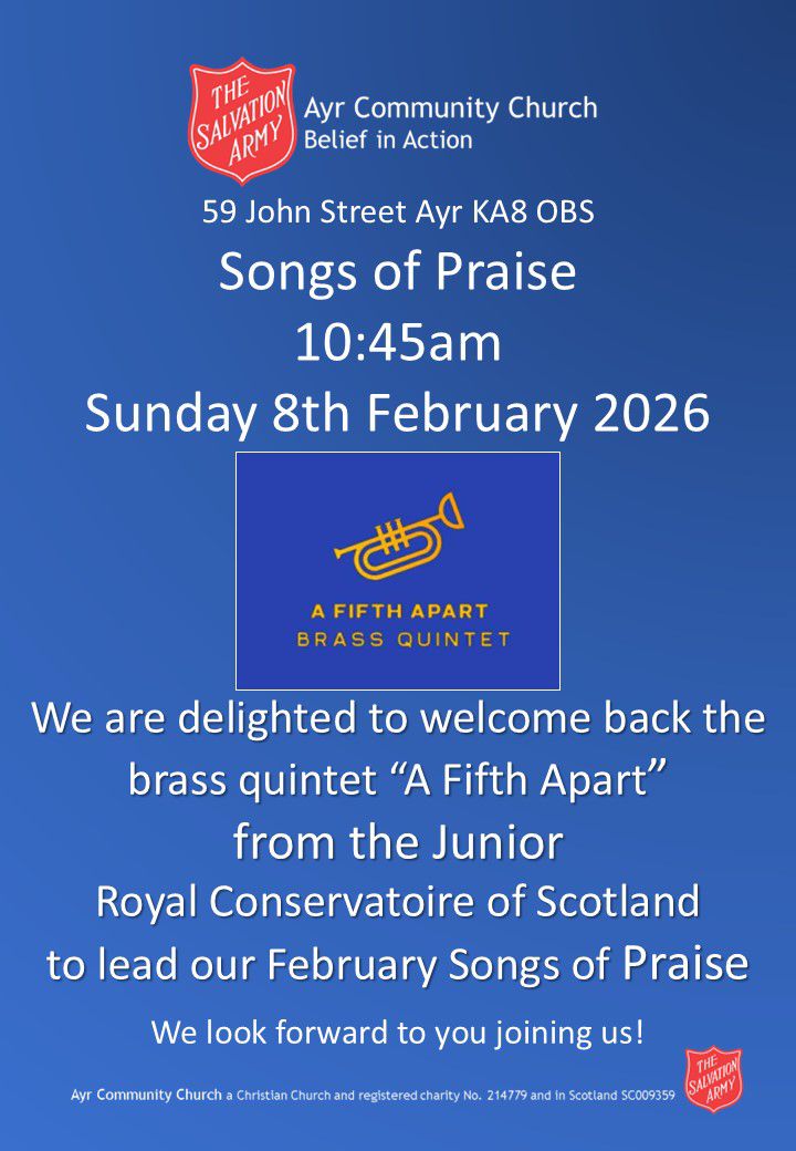 Captains Emma & Les were appointed as Corps Officers/Ministers with responsibilities for the Salvation Army’s congregations in both Ayr and Kilmarnock. They were appointed to additional ministry in Ayr in April 2025 having served the Kilmarnock community for eight years. As well as responsibilities for the work of The Salvation Army in both locations they also serve as pastors for Ayr and Kilnarnock Colleges and as Ecumenical Liaisons for other christian faith communities in South and East Ayrshire.